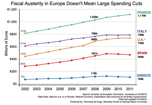 This is hilarious. Okay, you need a bit of background first. Briefly, Paul Krugman is all about blaming Europe’s problems on “austerity”, and then Veronique de Rugy at the Mercatus Center of George Mason University produced a chart showing that European governments haven’t really cut spending at all. In fact, spending in every country but Greece was higher in 2011 than in 2008. (I had made a similar observation in the case of Ireland in response to a Krugman column.)