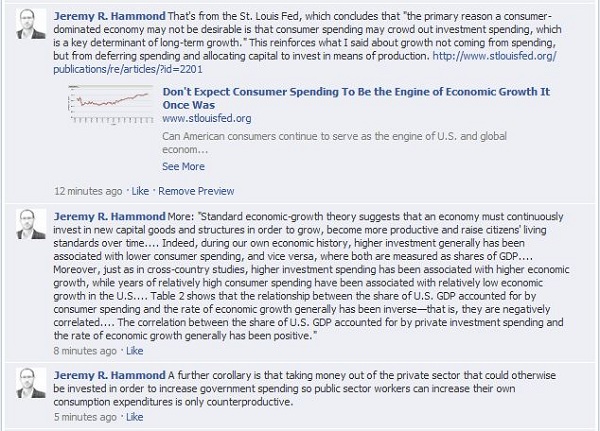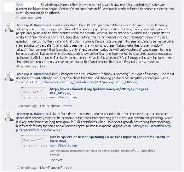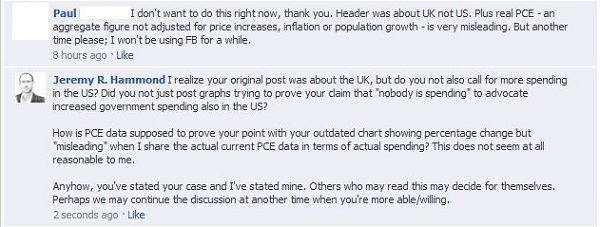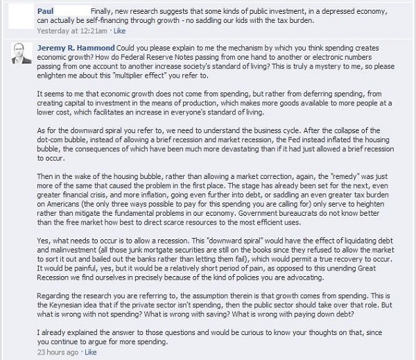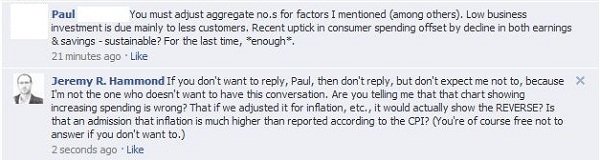So what happened after that was was a repeat. He posted more of his Keynesian nonsense and I replied to point out the problems with his policy prescription of more government spending, and in the end he deleted the post. This time, however, knowing that Paul was dishonest and predicting this outcome, I kept my own record of it by taking screenshots. Here is the discussion that ensued before he deleted it (I’ve removed Paul’s profile image and last name):