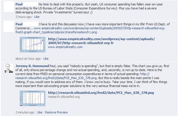Notice how he suggests I was using spending figures “to ‘prove’ out-of-control g’ment” when in fact all of the spending figures I provided to him were of private spending, not government spending (of course, government spending is out of control, but the point here is that I wasn’t even making that point in this Facebook discussion). Paul had at this point just completely lost it, totally incapable of making a coherent argument. But he still insisted that he was right.