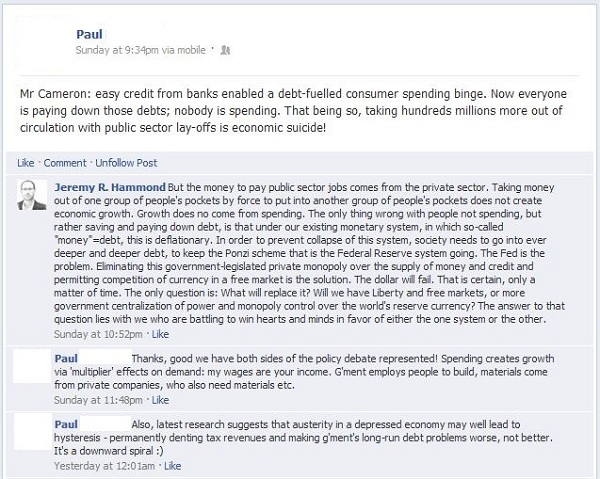 Now, that really bothered me, as you can imagine, so I unfriended him and a heated private message discussion followed in which he continued to try and argue with me and insist he was right. I pointed out that he wasn’t fooling anyone, and if he really honestly felt that he was winning the debate he wouldn’t have deleted it. I said I wasn’t going to debate him via private messages and challenged him to a public debate (this Paul is, like me, an independent journalist). He initially refused, but then relented and said, sure, let’s do it. And then he apologized and asked to refriend on Facebook, since even though we disagree on economics, he liked my writings on other topics (i.e., foreign policy). So I friended him again.