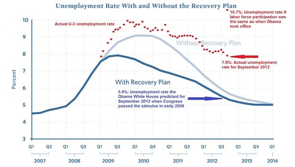 Now, you might not think the “stimulus” was exactly a success. Notice that the Obama administration promised unemployment would be at around 5.6% by now, while it was in fact at 7.8% as of last month, still higher than where they said it would peak if the “stimulus” package was passed.