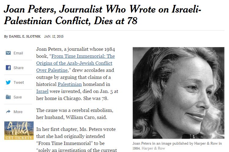 Two weeks ago, the New York Times had a piece about the death of Joan Peters, author of the book From Time Immemorial, which perpetrated the hoax that when the Zionists arrived there to establish their “Jewish state”, Palestine was an uninhabited land, and that the Arabs migrated there only after the Zionists had made the desert bloom. But instead of informing readers about the truth, the Times itself decided just to re-peddle the hoax.