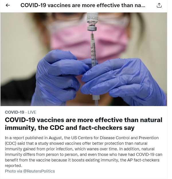 Scrolling down a bit further, I was treated by Twitter to the statement that “COVID-19 vaccines provide stronger and longer-lasting protection than natural immunity, according to the CDC”. (This was truthful enough inasmuch as the CDC does make that claim.)