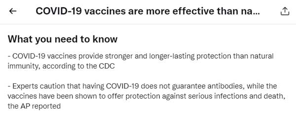 On Twitter on November 9, I observed the social media company telling users that “COVID-19 vaccines are more effective than natural immunity, the CDC and fact-checkers say”. As told by Twitter, the CDC “said that a study showed vaccines offer better protection than natural immunity gained from prior infection, which wanes over time”—thus implying that natural immunity is short-lived while the protection offered by COVID-19 vaccines does not wane over time.