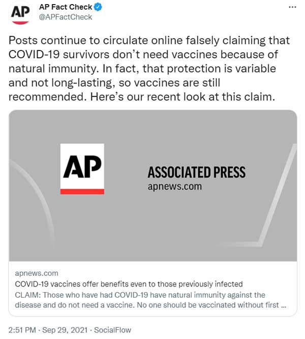 The AP’s Twitter post links to its “fact check” article, which proclaims that it is “False” that vaccination is unnecessary for people who already have natural immunity, which is to say that the AP claims that it is a scientifically proven fact that people with natural immunity require vaccination to be protected against COVID-19.