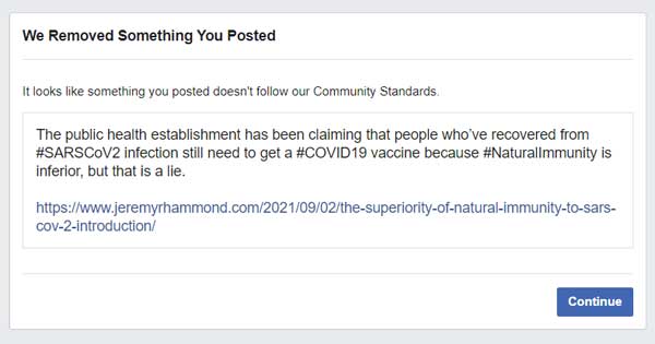 On November 1, I was notified by Facebook that a post of mine had been deleted on the grounds that it didn’t follow “Community Standards”, which prohibit “misinformation” about COVID-19 vaccines. My deleted post consisted of the observation that the “public health” establishment has been claiming that people who’ve recovered from SARS-CoV-2 infection still need to get a COVID-19 vaccine because natural immunity is inferior, along with the observation that this claim is false.