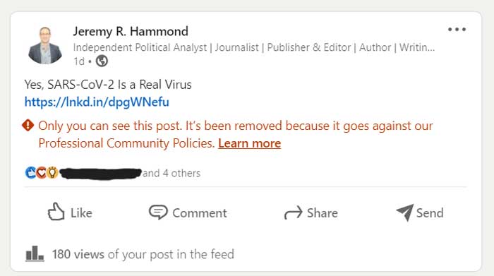 It is absurd that LinkedIn has removed this post of mine on the grounds that it violates your policies on misinformation, given the fact that the purpose of the article I was sharing is to fight the misinformation that SARS-CoV-2 has never been isolated. By removing my post, you are literally stopping me from helping to stop the spread of the misinformation that the virus does not exist. Please be reasonable and stop censoring me for sharing truthful information that combats harmful misinformation on the false grounds that by doing so I am spreading “misinformation”! Absurd!