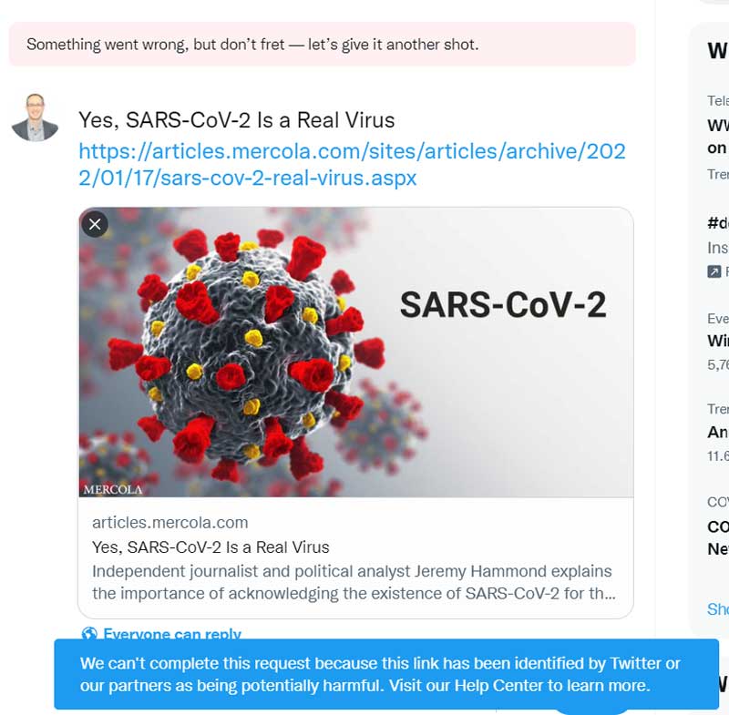 So, as you can see, both Twitter and LinkedIn, in their zeal to censor anything from Dr. Mercola, no matter how factual, have also blocked me from being able to share information to combat the false claim that SARS-CoV-2 does not exist, which truly is harmful misinformation.