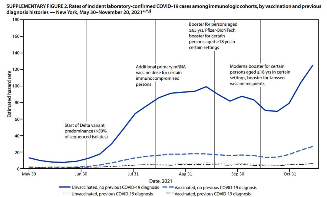 However, a study by CDC researchers published on January 19, 2022, in the CDC’s Morbidity and Mortality Weekly Report (MMWR) not only shows incontrovertibly that natural immunity offered better protection than vaccine-induced immunity against the Delta variant of SARS-CoV-2, but also challenges the assumption—never studied in clinical trials—that vaccination after recovery from infection offers such a substantial additional benefit that it clearly outweighs the risks from these pharmaceutical products.