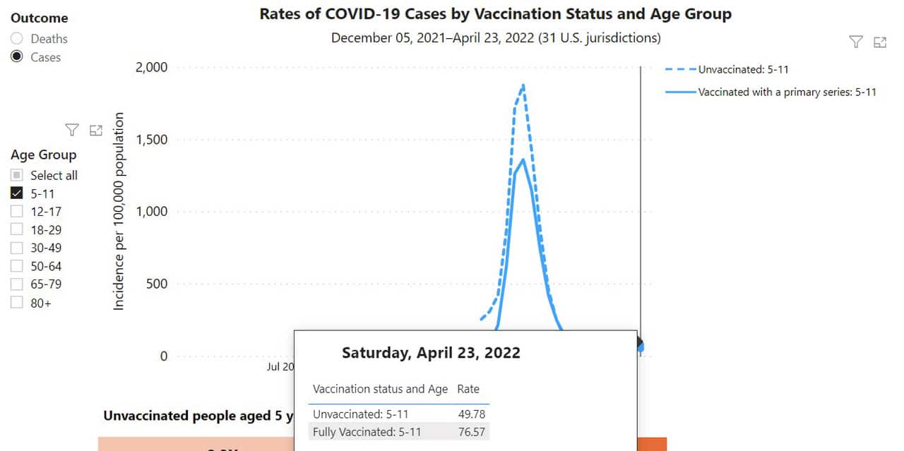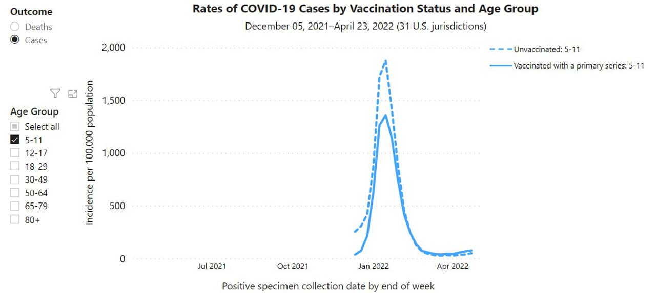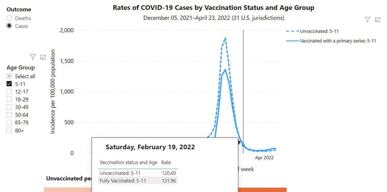 In fact, other data from the CDC show that COVID-19 case rates for children aged five to eleven have been higher for vaccinated than unvaccinated children since mid-February.