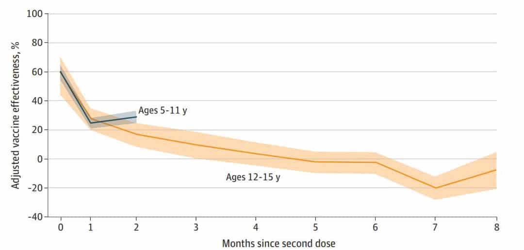 The key conclusion of that study was that, “Among children and adolescents, estimated VE for 2 doses of BNT162b2 [the Pfizer-BioNTech COVID-19 vaccine] was modest and decreased rapidly.”