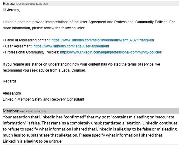 Invariably, when I would request the LinkedIn representative to specify what information was contained in my post that LinkedIn was claiming to be false or misleading, they would refuse.