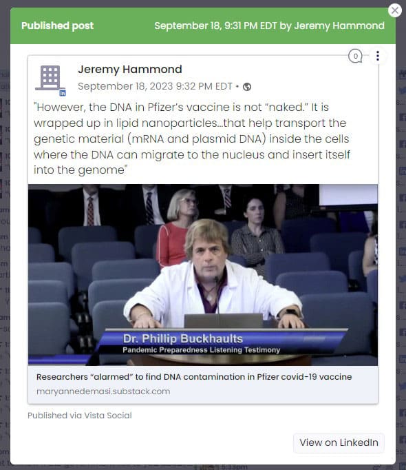 I use a social media management tool to schedule posts to go out to my Facebook, Twitter, and LinkedIn accounts, and on September 18 at about 9:30 p.m., I shared an article by the superb journalist Maryanne Demasi titled “Researchers ‘alarmed’ to find DNA contamination in Pfizer covid-19 vaccine”.