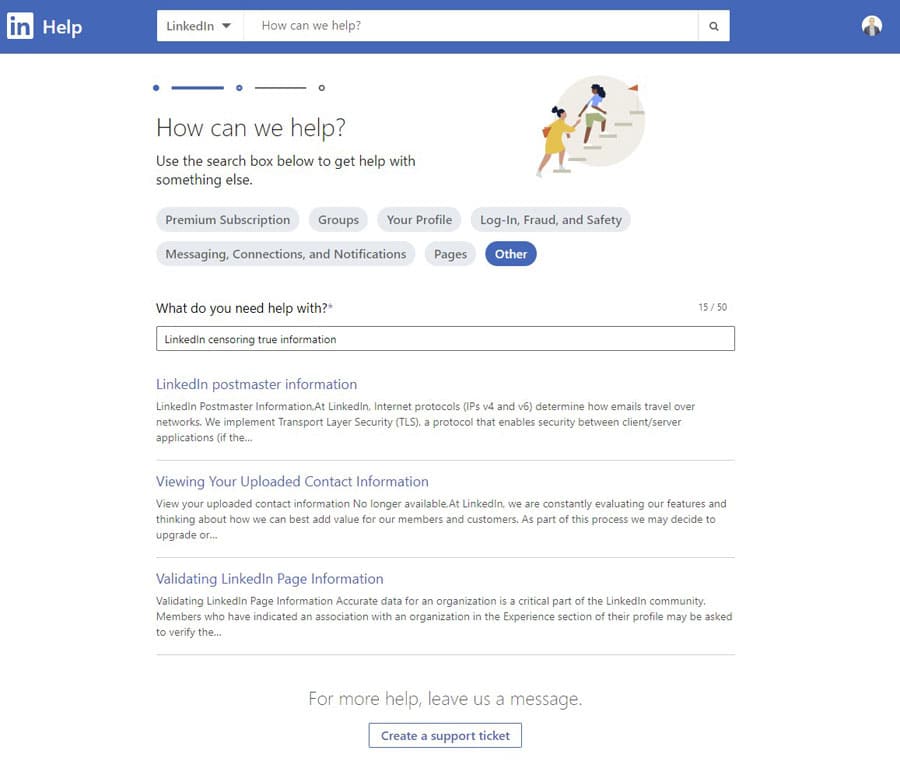 I have no hopes that my experience will be any different this time around, but I’m going to go ahead and create a ticket. I click the link and am presented with a few default options about what I need help with, none of which are applicable, so I’m selecting select “Other”. That opens up a text field where I can specify what I need help with, so I’m entering “LinkedIn censoring true information”.