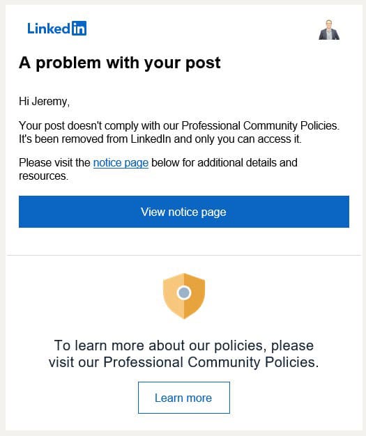 Violating our User Agreement and our Professional Community Policies can result in action against your account or content. Depending on the severity of the violation, we may limit the visibility of certain content, label it, or remove it entirely. When we do this, we also generally send you a notice that your content violates our policies, how your content violates our policies, and the action we’re taking. If you believe your content has been removed in error, you’ll have the opportunity to submit an appeal.