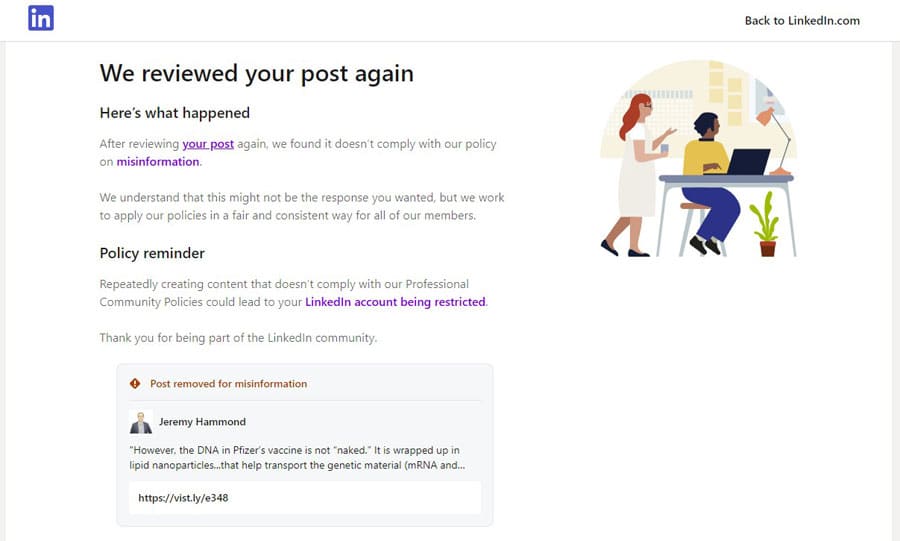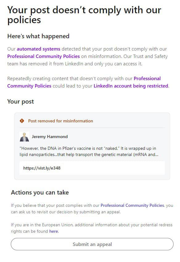LinkedIn has removed a post of mine with the accusation that it contains “misinformation”. However, this is incorrect. My post does not contain any information that is false or misleading. My post contains factually accurate reporting on a matter of vital importance to the public interest. LinkedIn claims to offer me an “appeal” process, but I completed that process without LinkedIn ever specifying what information contained in my post LinkedIn is claiming to be false or misleading, much less giving me an opportunity to explain why the information in my post is true. The result is that LinkedIn insists that my post violates the Professional Community Policies.