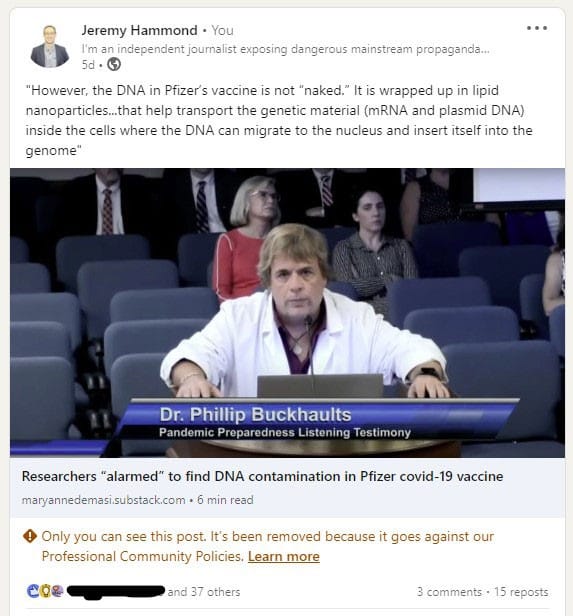 Now that you’ve seen how LinkedIn removed my post “for misinformation” even though Demasi’s article simply reported how an expert who confirmed that COVID‑19 vaccines are contaminated with DNA from the manufacturing process testified about why this is a problem to a South Carolina Senate committee, and even though I merely quoted an excerpt from the article accurately explaining that the mRNA and DNA in the vaccine is encapsulated in a lipid nanoparticle that enables the genetic material to get inside the cells.