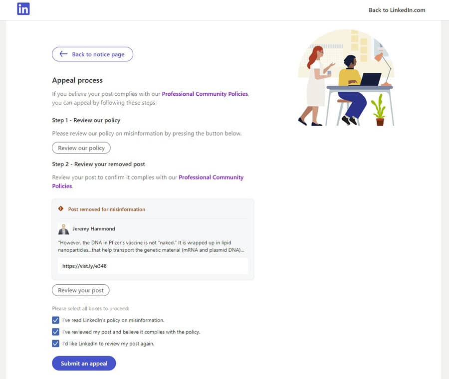 That was it. When LinkedIn accuses you of spreading “misinformation” and you “appeal” their decision, it doesn’t mean you get a chance to be told by LinkedIn what information it is claiming to be “false or misleading”, much less that you get a chance to explain to LinkedIn how they got it wrong.