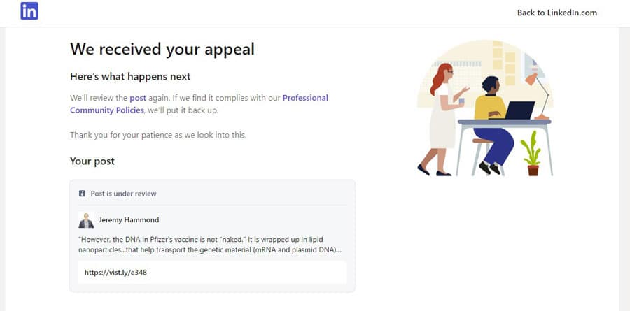 I have no intent to put up with LinkedIn’s duplicitousness and violation of its user agreement with me, so I’m going to document the dispute procedure and give you an inside look at how LinkedIn’s “fact checking” works—and how it violates its own User Agreement by denying a legitimate appeal process to victims of its censorship whose only offense is having shared facts that the “public health authorities” don’t want us to know about.