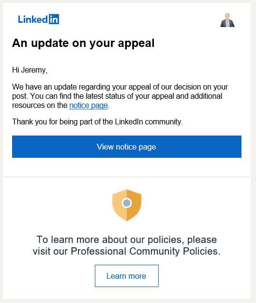 Okay, as I anticipated, LinkedIn’s response was to maintain its position that my post contains “misinformation”. On the morning of September 25, I received an email providing “An update on your appeal”. It links to a “notice page”.