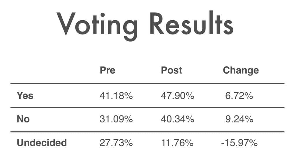 Before the debate started, audience members voted. As I learned afterward, a plurality of 41.18% were already persuaded of the debate resolution at the start, whereas 31.09% opposed it and 27.73% were undecided.