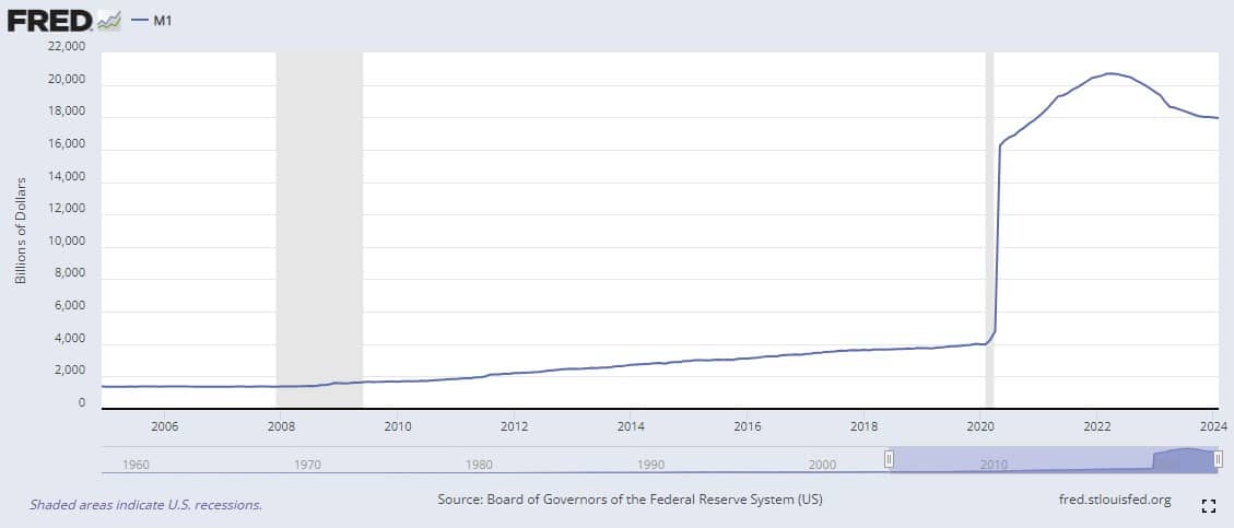 And here’s a look at the “M1” measurement of the money supply showing an increase from about $4 trillion to over $20 trillion.
