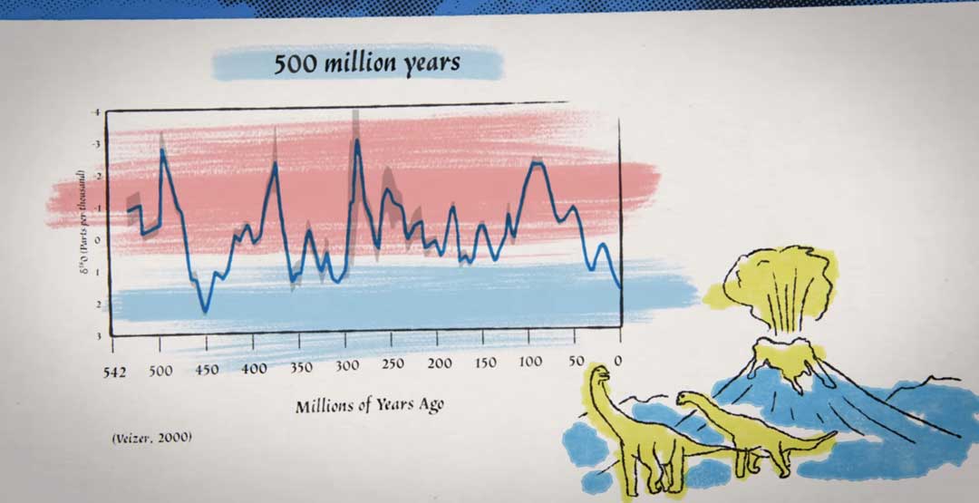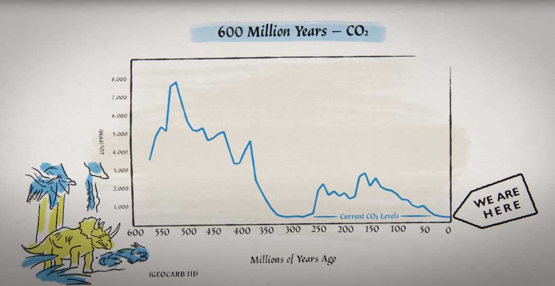 The counternarrative begins by taking a broad look at Earth’s climate, presenting this graph showing CO2 levels over the past 500 million years, which reveals that current levels are actually low in that historical scale: