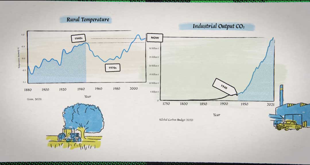 The point is also made that the cooldown of the 1970s is not what one would expect if human CO2 emissions were the principle driver of the historically recent temperature increase.
