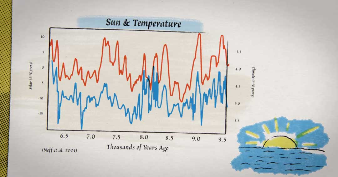 The question arises: If global temperature is not primarily driven by atmospheric CO2 levels, then what does drive it? One obvious place to look for an answer is that giant nuclear reactor at the center of our solar system. The film next shows this graph showing what is said to be a correlation between solar activity and a proxy measure of temperature: