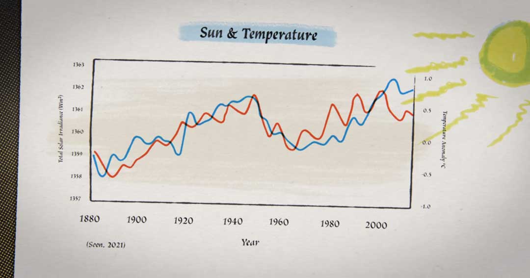 This graph is presented from a 2021 paper by Willie Soon, a featured guest in the film, showing what appears to be a correlation between solar activity and temperature: