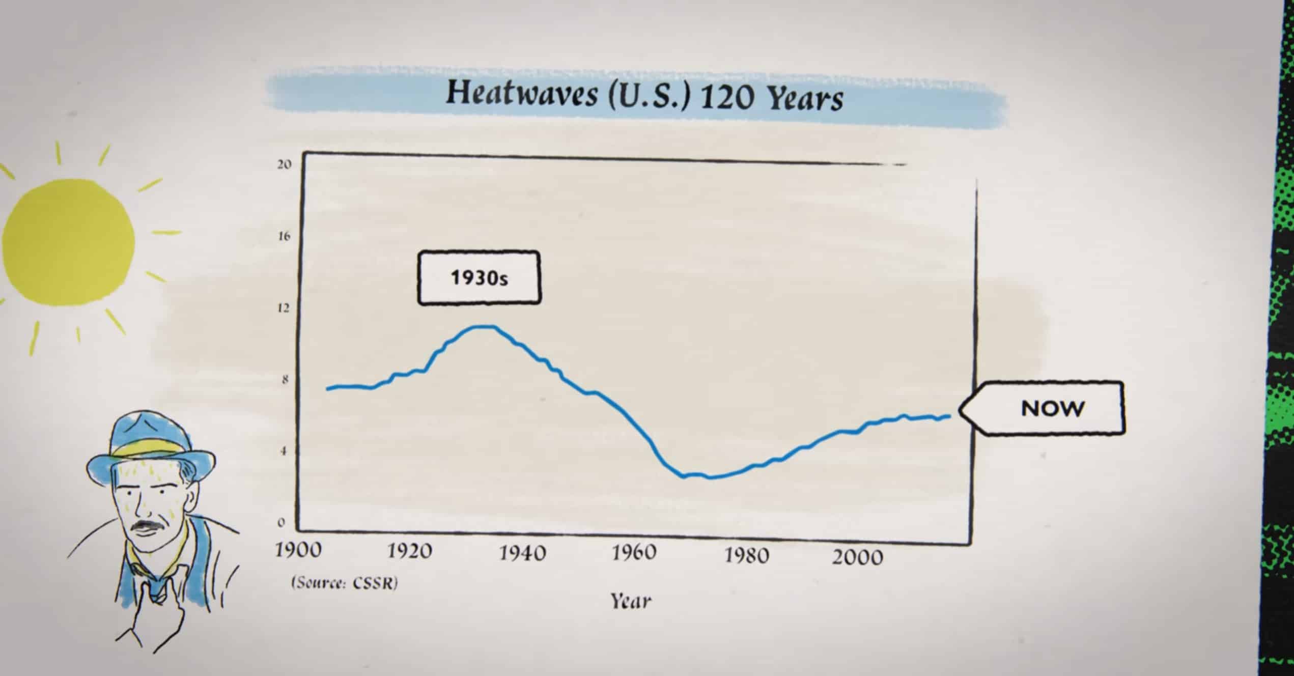 The following graph is presented showing that heatwaves were more extreme in the 1930s than in recent years: