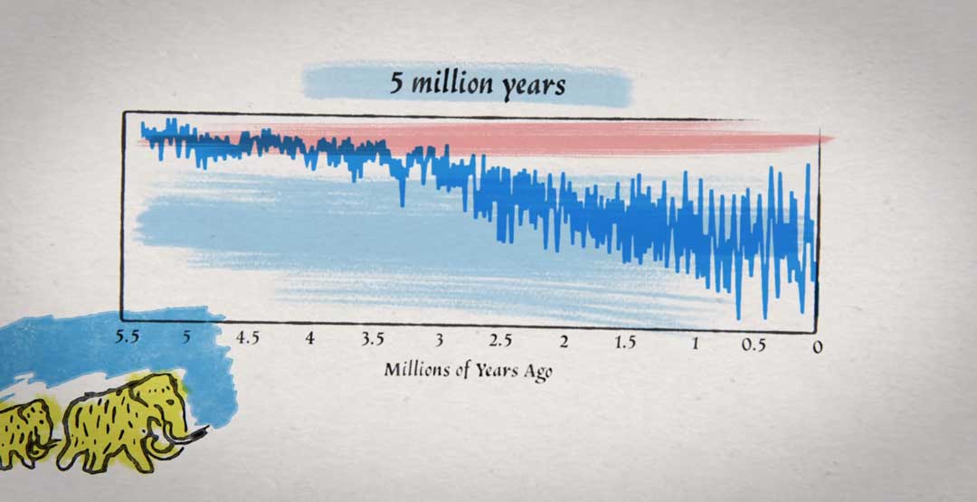 Then another graph is presented that zooms in to the past 5 million years, which shows a general cooling trend: