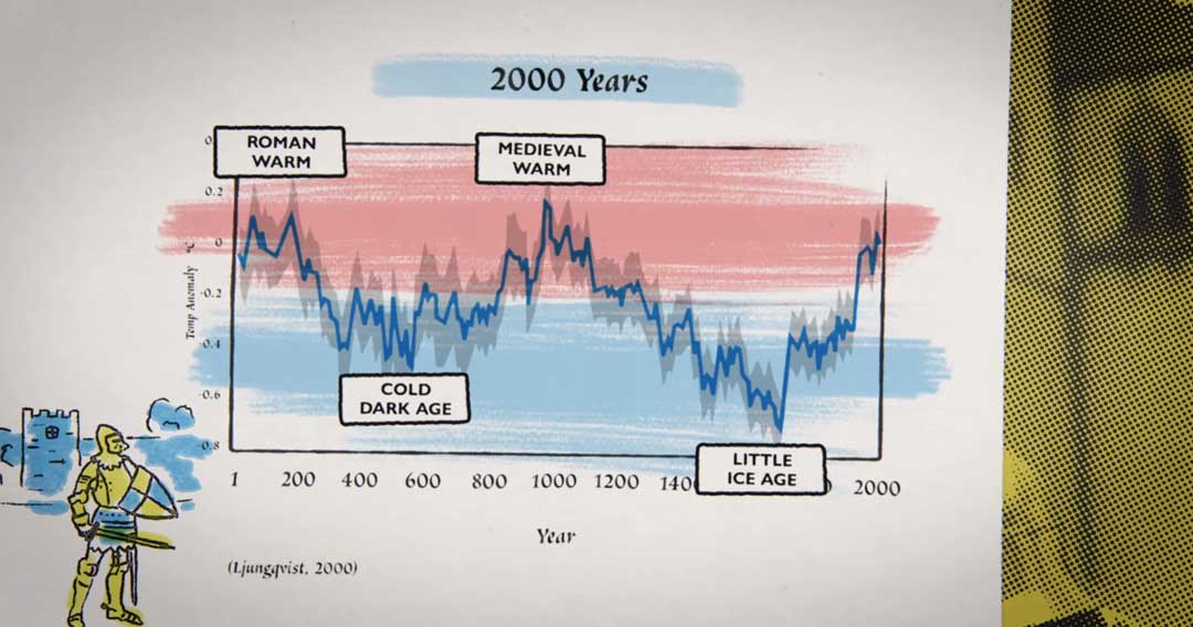 Now, none of this is to say that human CO2 emissions are not contributing to warmer temperatures, so let’s keep zooming in. Next, the film presents the following graph looking at temperatures over the past 2,000 years, showing the “Roman Warm Period”, the “Cold Dark Age”, the “Medieval Warm Period”, and our current retreat from the “Little Ice Age”: