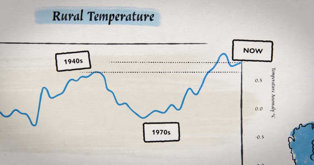 Here’s a graph shown of rural temperatures showing a cooling period through the 1970s followed by more recent warming barely higher than the peak reached in the 1940s: