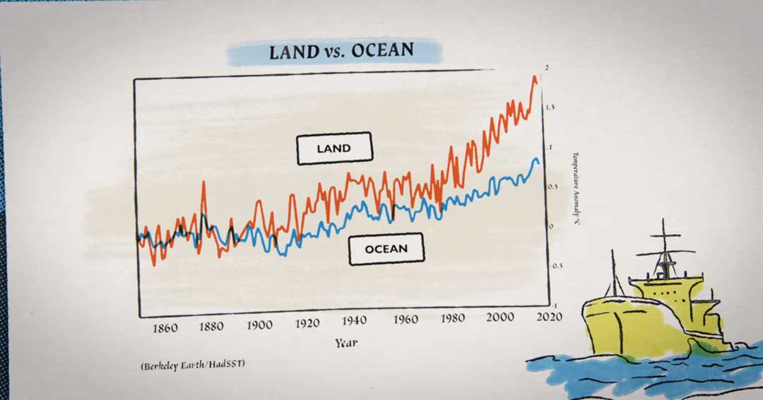 A considerable portion of the film is then spent focusing on the contribution of land-based thermometer stations, with the argument being that the “urban heat island” effect artifactually biases the data in favor of more dramatic temperature increases.