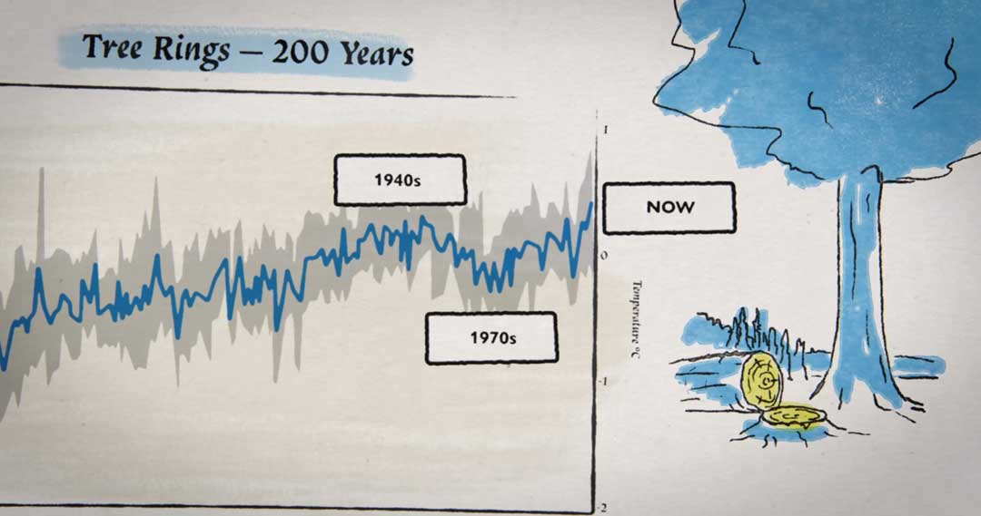 Another graph meant to illustrate the point is of temperatures reconstructed from tree ring data, similarly showing a less dramatic increase since the cooler 1970s: