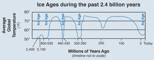 The UGS provides this helpful graph showing a simplified overview of when ice ages have occurred during the past 2.4 billion years: