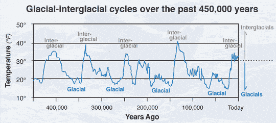 The UGS also provides this graph looking at the past 450,000 years within the current ice age, which shows the swings between glacial and interglacial periods: