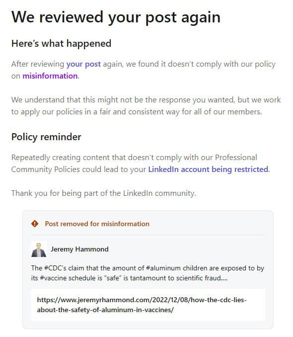 I detailed how that faux “appeal” process works and how LinkedIn effectively violates its own terms of use in my September 2023 article “LinkedIn Censors DNA Contamination in mRNA COVID-19 Vaccines“.
