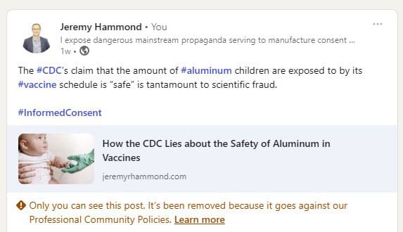 I have previously had numerous posts removed under the pretext that they contained “misinformation”. In fact, I was even “permanently” banned by LinkedIn for this alleged violation of their community guidelines and hence of their terms of use.