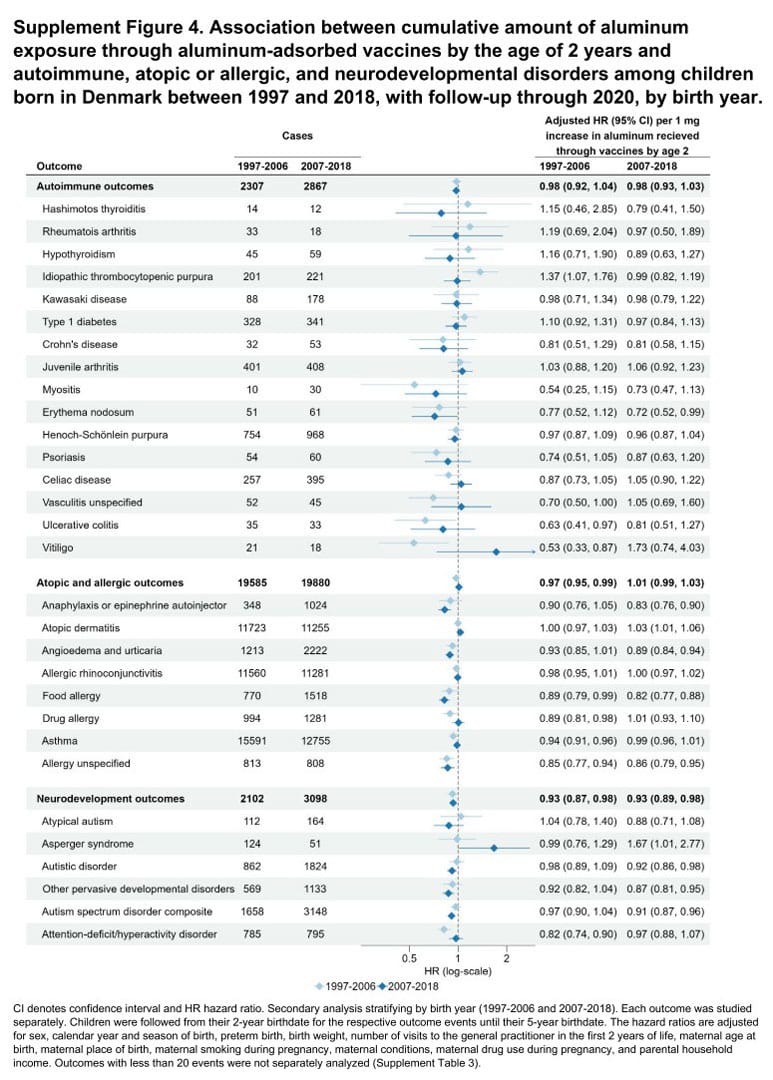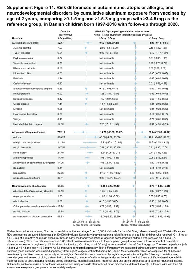 He points out how the authors’ claim that they “did not find evidence” that aluminum-adjuvanted vaccines are associated with any of the health outcomes they considered is directly contradicted by their own data.
