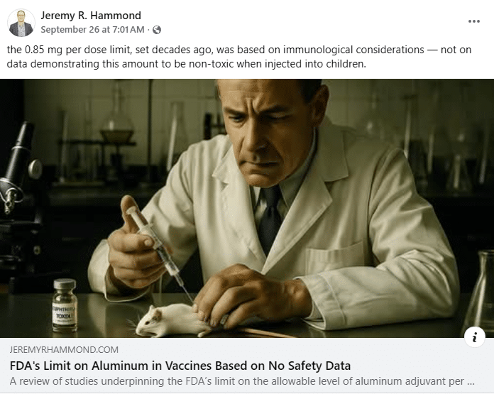 The article was published under the headline “FDA’s Allowable Level of Aluminum in Vaccines Based on Decades-Old Tests — but the Tests Had Nothing to Do With Safety“. I republished it on my own site according to CHD’s terms and shared it to social media.