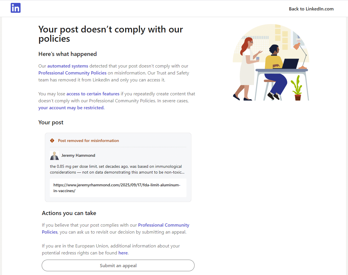Thus, journalists are forbidden by LinkedIn from reporting factually accurate information to correct government-approved disinformation about vaccines.